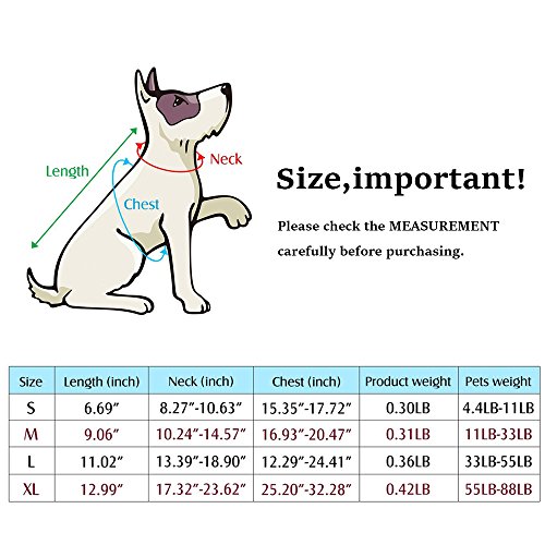 Warm Tips: 1.Please measure your pet before your purchase, any size issue please feel free to contact us. 2.Small size fits dogs with 8.27 to 10.63-inch neck, 15.35 to 17.72-inch chest, 4.4 to 11-LB Pets weight. see size chart to the Product size Picture for further details 0