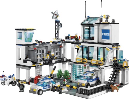 - Feature : The whole Police Station is on alert to catch escaped prisoners, When you catch the robbers, throw them back into jail / Set has lots of realistic details, including gates that open, spotlights on roof, command base tower, garage doors that slide open and more / Set includes 2 prison cells with toilets and beds, keys hanging outside the prison cells, and even handcuffs to put on the prisoners / Police Headquarters has rooms for interrogation, a coffee break, computer work and a refrigerator with water cooler / Includes police headquarters, prison transport truck, car and motorcycle / This fun set can be divided in two and arranged however you like it / Contains 953 pieces / This set also includes 7 minifigures and 3 police vehicles / Stands over 10" tall and has a 15" x 10" base / But be careful not to let the prisoners escape through the trick walls