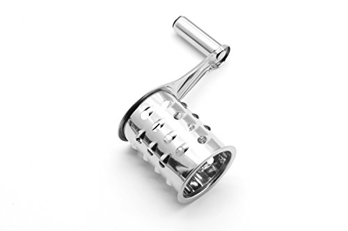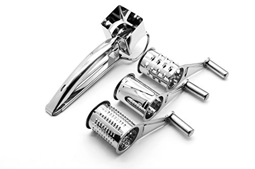 - HIGHER QUALITY: Made of food grade stainless steel, the Rotary Cheese Grater Includes 3 Different Interchanging Rotary Drums & Slicer; sturdier & higher quality than the cheap plastic Rotary Grater.