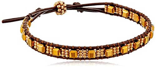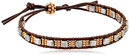 -. Binding : Jewelry -. Brand : Miguel Ases -. Department : womens -. Feature : Leather bracelet featuring row of mixed-shape glass beads and slip knit closure / Made in the USA -. Label : Miguel Ases -. Manufacturer : Miguel Ases -. Model : B57006-Parent -. MPN : B57006-Parent -. PartNumber : B57006-Parent -. ProductGroup : Jewelry -. ProductTypeName : FASHIONNECKLACEBRACELETANKLET -. Publisher : Miguel Ases -. Studio : Miguel Ases -. Title : Miguel Ases Cube and Miyuki Single Row Brown Leather Slip-Knot Bracelet