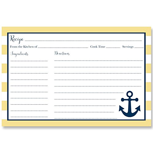 Recipe Cards, Nautical, Bridal Shower, Housewarming, Wedding, Personal, Business, Stripes, Anchor, Nautica, Sea, Sailing, Navy Blue, Yellow, 24 Back Printed Cards, Anchored in Love