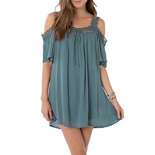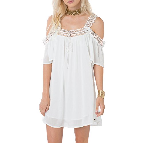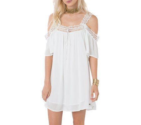Woven dress, cold shoulder, fully lined, crochet straps, self-spaghetti at front neck