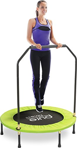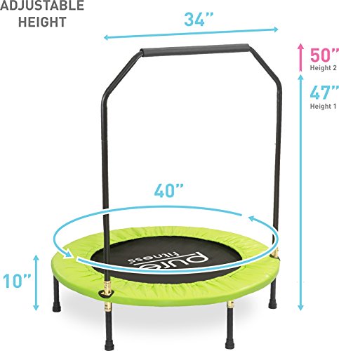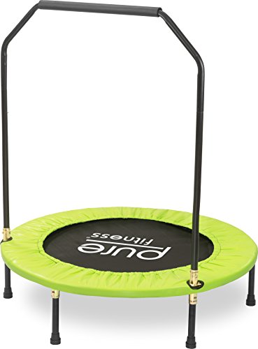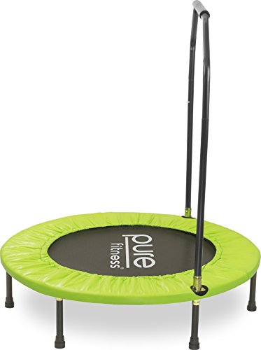 Studio : Pure Global Publisher : Pure Global Binding : Sports Product Description The Pure Fitness 40" Mini Rebounder Trampoline with Adjustable Handrail provides an excellent low-impact cardio exercise option. Exercising on mini trampolines is proven to be effective in boosting cardiovascular health while reducing the strain on joints. Exercising regularly with this trampoline trainer will help to develop and tone leg and core muscles. The exterior trampoline pad is cushioned to avoid injuries if bouncing out of control brings the bouncer too close to the springs. This trampoline is constructed with 30 high tension dual-springs and steel rubber-tipped supports which make this trampoline sturdy and durable with a weight capacity of 250 lbs. Mini rebounder trampolines are excellent for cardio exercise routines as they are gentle on joints. Regular cardiovascular exercise at a sustained elevated heart rate helps to minimize the risk of cardiac disease while engaging and strengthening muscles and balance. The easily adjustable hand rail provides added safety and provides a firm and stable gripping apparatus to maintain steady, controlled cardio exercise. The jump mat is made of heavy-duty polypropylene to ensure sustained bouncing and elasticity. The Pure Fitness 40" Mini Rebounder Trampoline with Adjustable Handrail is quick and easy to assemble and no additional tools are required. 0