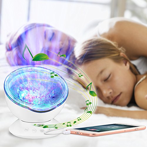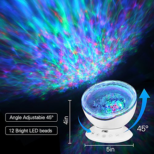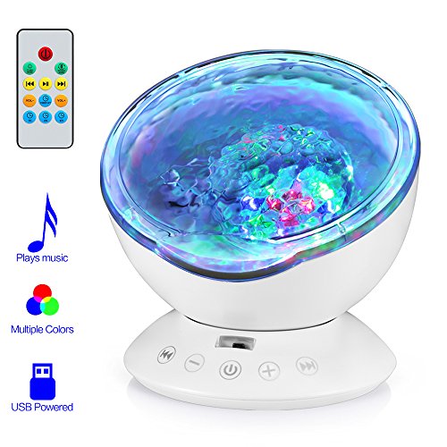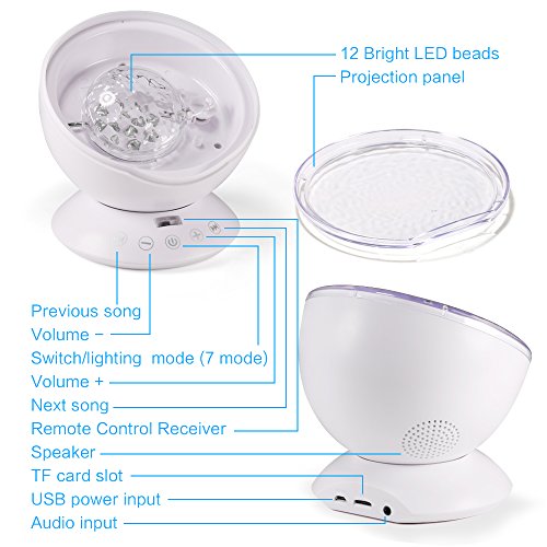 Studio : Hallomall Publisher : Hallomall Binding : Baby Product Product Description Special Features on Ocean Wave Projector: ◆7 colorful light mode rotate mode ◆12 bright led beads ◆Smart touch sensor key ◆Remote control ◆Angle adjustable ◆Built-in music ◆TF card slot ◆Audio input ◆1H/2H/4H auto off timer How to use it: 1. Connect USB to computer(or others ) 2. Turn the bottom switch on 3. Push the POWER BUTTON (the middle one among the five) for 3 seconds 4.Then comes out the light and music! For more operation, please refer to the user manual Kindly Notes: 1. Please do not allow children under 6 years old to use it alone 2. Please do not place the product on non-flat surface to prevent fall broken 3. This product is non-waterproof, prohibited storage or use in the place of humid or high temperature Specification: Rated volt/current: DC5V/1A Rated power: 2W Speaker: 4Ω/3W Respond frequency: 160Hz-20KHz Motor specification: 5V/13 circle Product material: ABS/PC/Metal/Electronic components USB cable length: 1.2M/3.95ft Audio cable length: 0.6M/1.97ft Packaging Included: 1*Ocean wave night light 1*audio cable 1*matched USB cable 1*remote control(batteries not included) 1*user manual