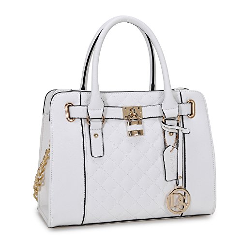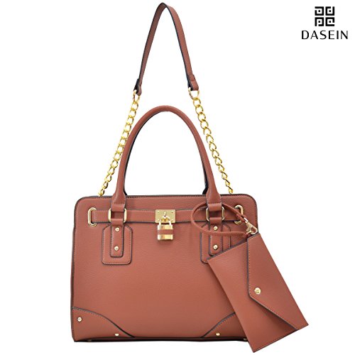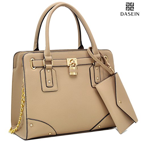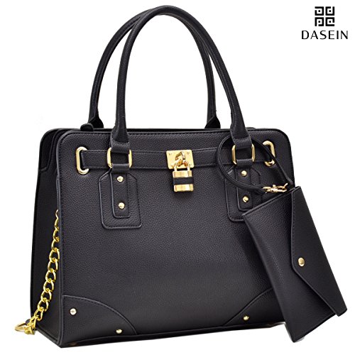 -. Brand : Dasein -. Department : womens -. Feature : A upgrade version of our padlock handbags. Crafted in vegan faux leather with interior beige lining for easy access. Polished gold tone hardware. Strengthened handles / Quickly store your phone or keys in the exterior rear zippered pocket or the removable envelope wristlet which fits in most smartphones, including iphone 7 plus with a size of 7.5"x4.25"x1"and has flap snap for closure / Conveniently carry with dual rolled top handles by hand, or use the detachable chain strap to carry as a shoulder/crossbody bag for hands-free ease / Top zip closure secures your personal belongings while interior wall zipper and accesory pockets keep everything organized. Bottom and corner studs for protection / New arrival this fall. Designed with fashion and function in mind, this satchel handbag is perfect for work and everyday use. Approx. 14.25"W x 11.3"H x 6"D. 6"Handle Drop. 14.5"Strap Drop -. ProductGroup : Shoes -. ProductTypeName : HANDBAG -. Title : DASEIN Top Handle Satchel Handbag Zip Purse Belted Padlock Bag w/ Chain Shoulder Strap