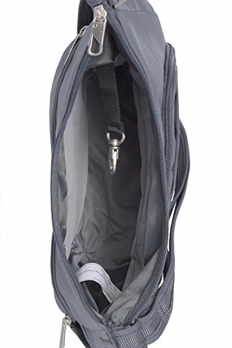 Fabric/Polyester Main compartment has RFID blocking card and passport slots