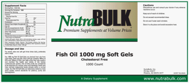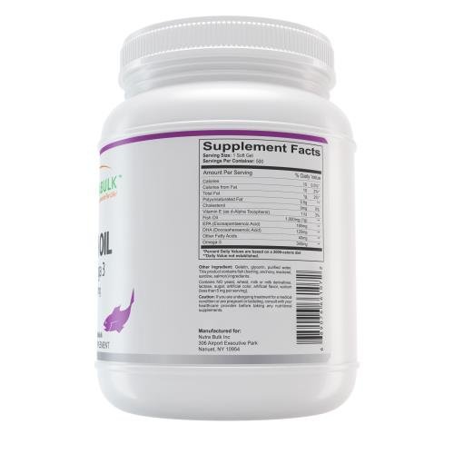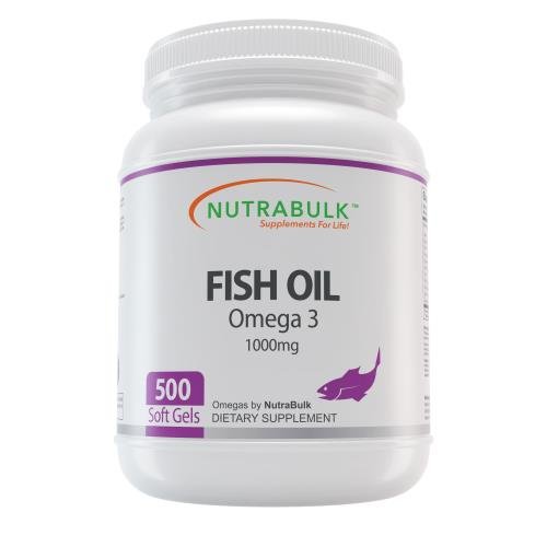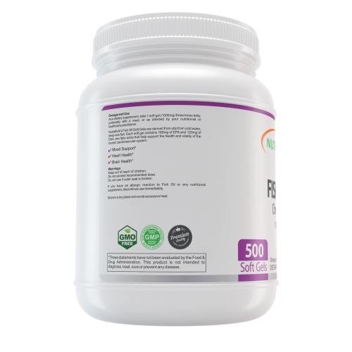 NutraBulk Omega-3 Fish Oil Soft Gels 500 COUNT Bottle $19.99 LESS THAN 4 CENTS EACH Primary Use: To Lower Cholesterol and Improve Cardiovascular Health NutraBulk 1000mg Fish Oil Soft Gels are derived from oils from cold water, deep sea fish. (Not sourced from farm-raised fish!) Each soft gel contains 180mg of EPA and 120mg of DHA, two omega-3 fatty acids that help support and maintain the health and vitality of the human cardiovascular system. Omega-3 fatty acids are considered to be important for cellular, heart and metabolic health, and help maintain triglyceride levels already within a normal range. Our Fish Oil Soft Gels are laboratory tested to meet strict quality control standards for potency, purity and disintegration.Feature