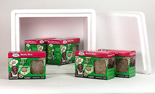 -. Binding : Misc. -. Brand : Rudy Greens Doggy Cuisine -. EAN : 0851872005019 -. Feature : Cooler case contains 5 boxes of Rudy Green's, each with four 6-oz pouches that can be thawed in warm water in minutes / A great way to add nutrition and variety to a dry diet / Perfect for sick or older dogs as a delicious and healthful meal / Simple, limited ingredients make it good for dogs with allergies or to hide medications / Low calorie and nutrient dense for overweight dogs on restricted intake -. Label : Rudy Green Ventures - DROP SHIP -. Manufacturer : Rudy Green Ventures - DROP SHIP -. Model : 5 pack -. MPN : 5 pack -. PackageQuantity : 1 -. PartNumber : 5 pack -. ProductGroup : Pet Products -. ProductTypeName : PET_SUPPLIES -. Publisher : Rudy Green Ventures - DROP SHIP -. Size : One Size -. Studio : Rudy Green Ventures - DROP SHIP -. Title : Rudy Greens Doggy Cuisine 24 oz Beefy Rice Dog Food, One Size -. UPC : 851872005019