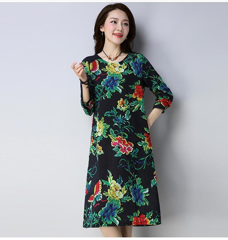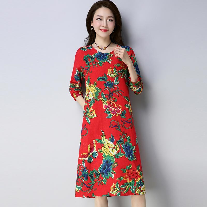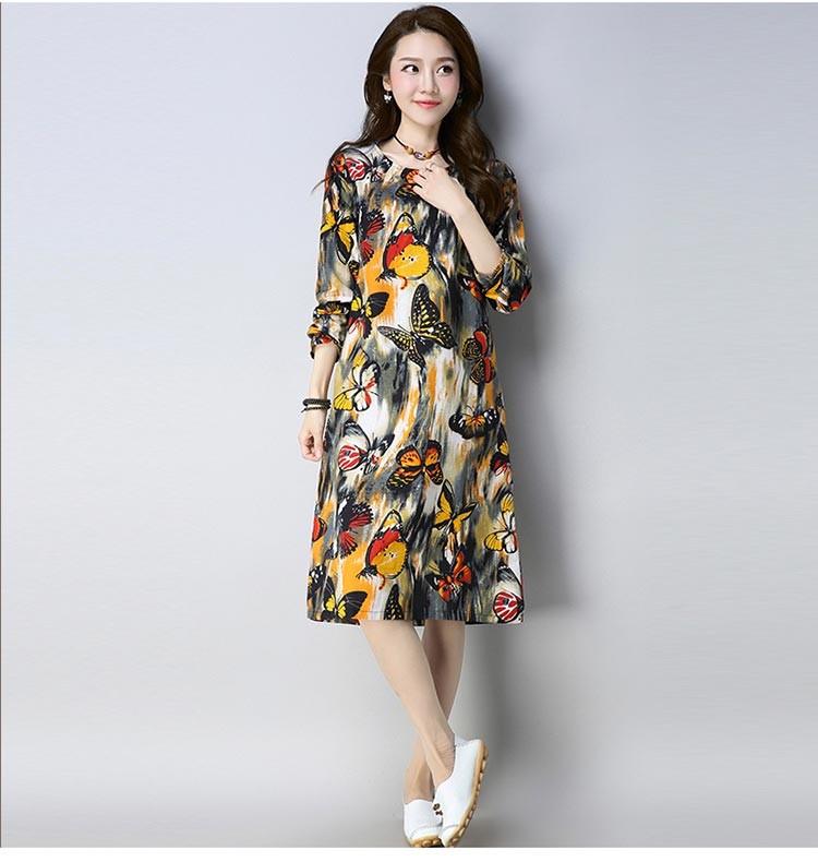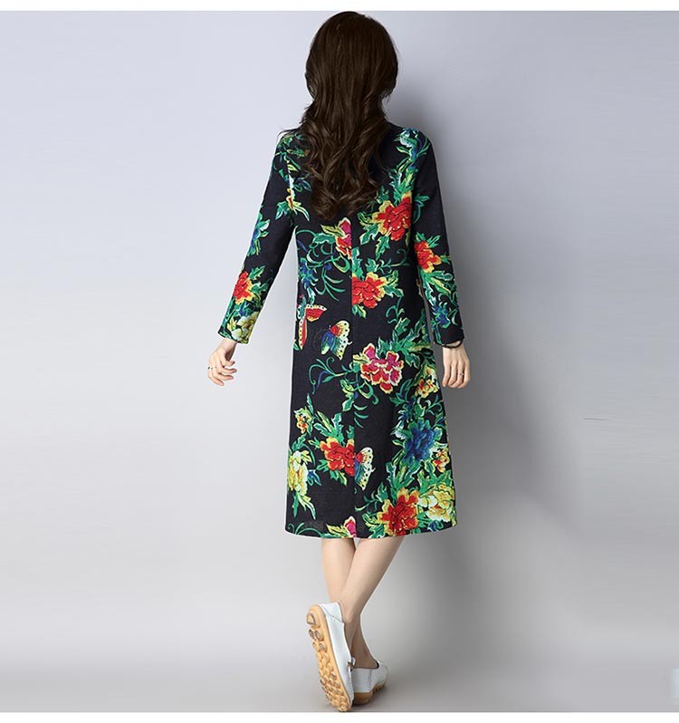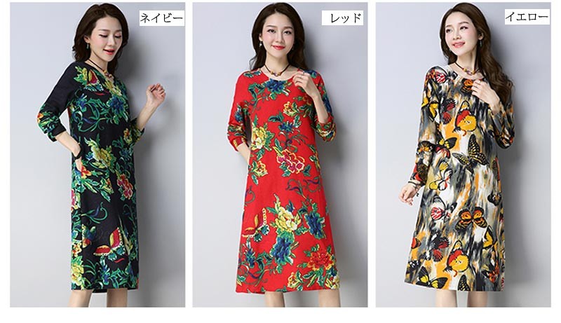 バタフライと花柄の華やかなコットン長袖ルーズシルエットワンピース♪