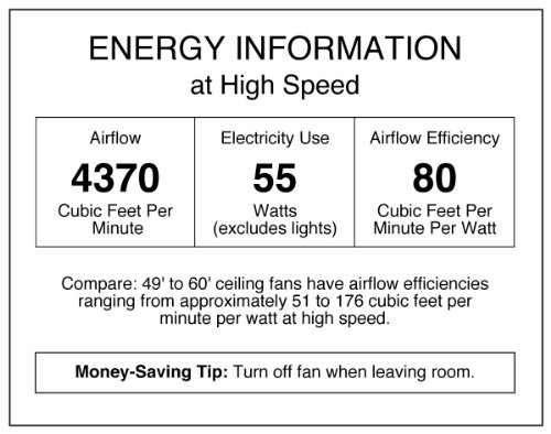 Airflow: 4,370 cfm; Energy Usage: 55 watts without lights; Airflow Efficiency: 80 cfm per watt