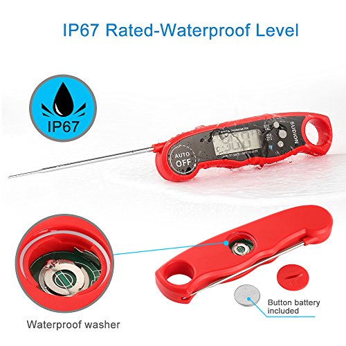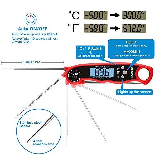 - 【EASY & SECURE to USE 】:This Instant Read meat thermometer is with 4.7 inch food grade Stainless Steel Collapsible Lnternal Probe, offer a safety environment and it doesn't damage the meat as it goes in. Built-in strong magnetic and Hook design, can be attached to the refrigerator or kitchenware above.which is able to be folded up and easy to stored. Built-in button battery, auto-shut off to save battery life if inactivity stays for 10 minutes. Suitable for indoor and outdoor cooking.