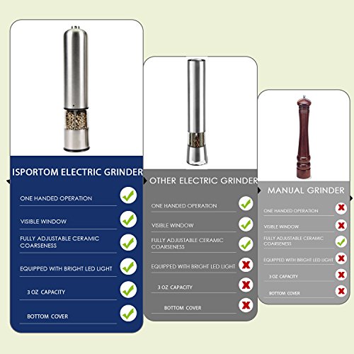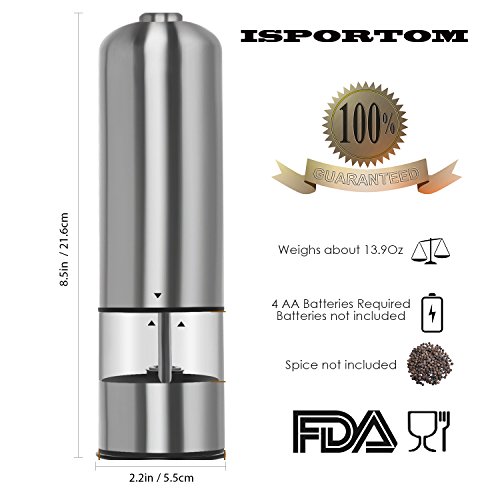 Isportom Salt Mill, Pepper Grinder, Salt and Pepper Grinder Battery Powered, One-Handed Automatic Adjustable Salt and Pepper Shaker, Electric Pepper Mill with Big Capacity and Streamline Design
