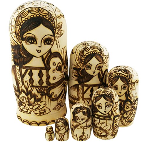 -. Feature : Beautiful traditional Russian girl,with a big butterfly and flower around to embellish / All the making process is handmade.Every inch of the pattern is sculptured / Contains 7 dolls with decreasing size placed one inside the other to appear as one / Kids will love these nesting dolls and spend time playing with them / Russian nesting dolls is full of special meanings,it's a perfect gift to give anyone and special decoration
