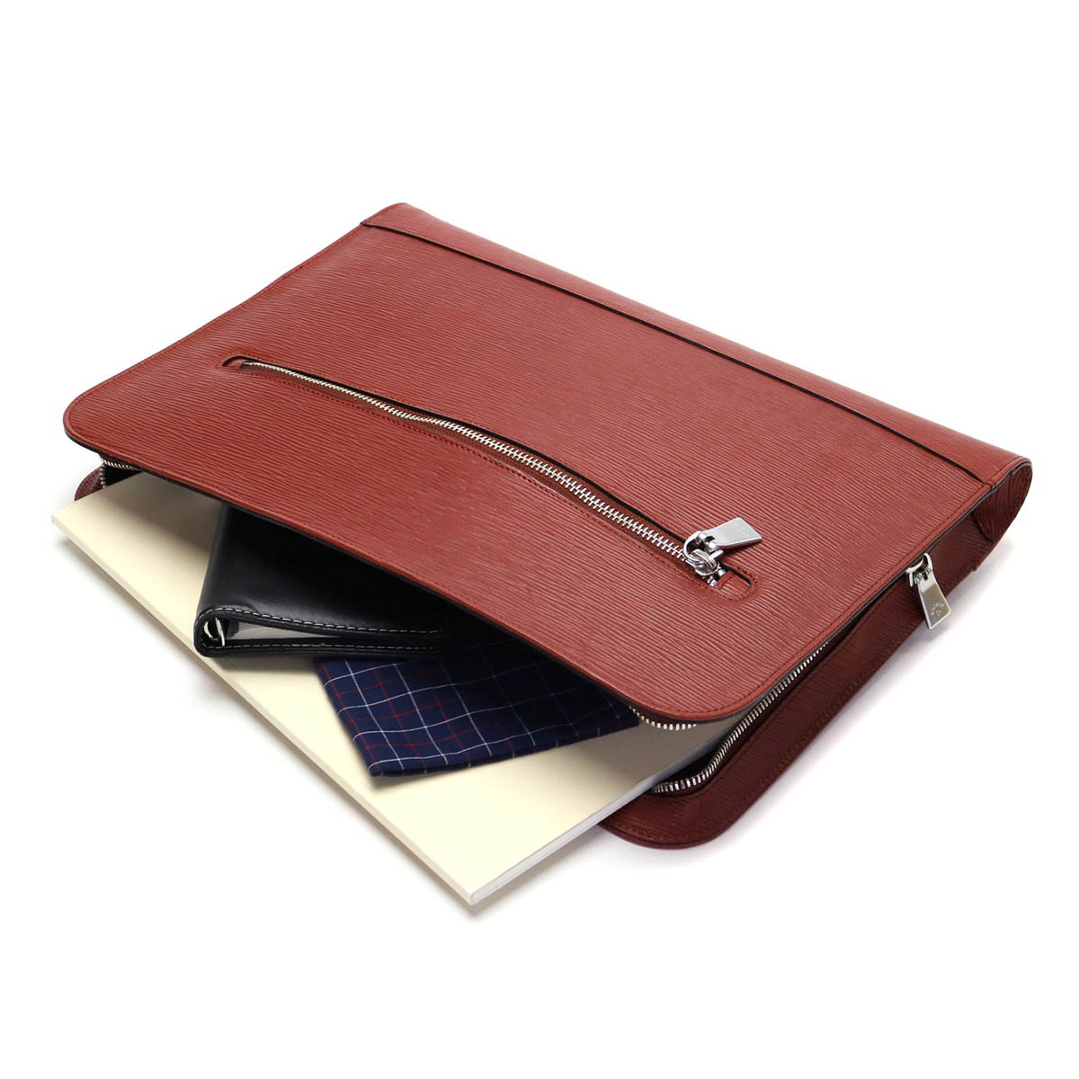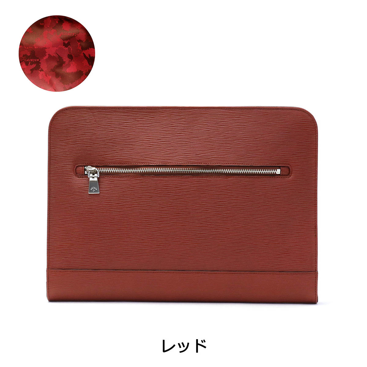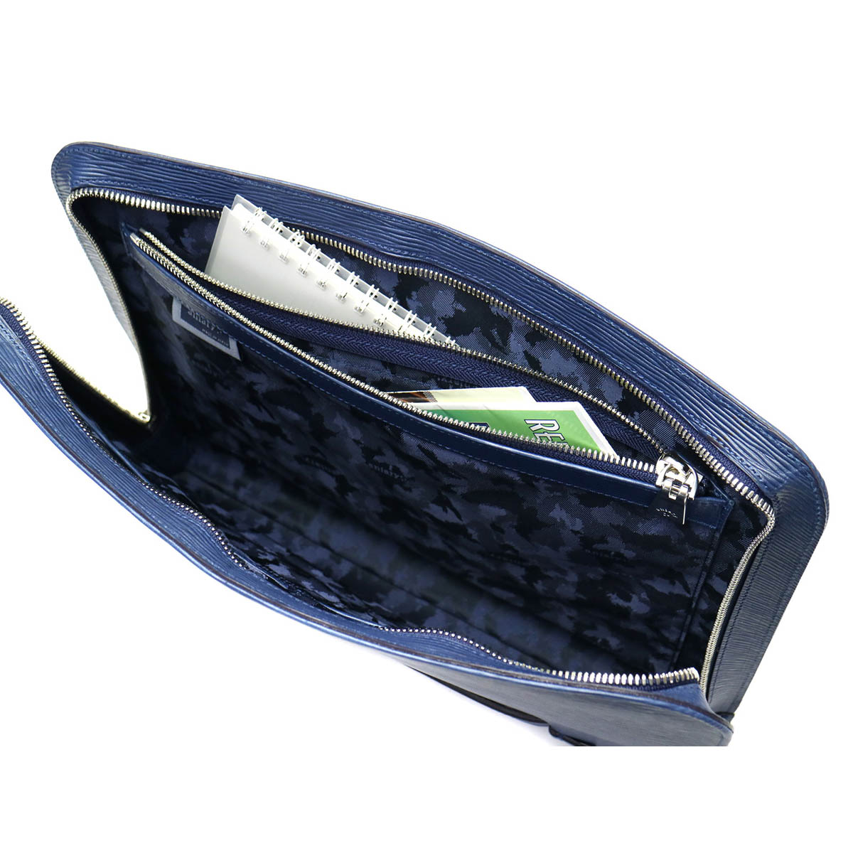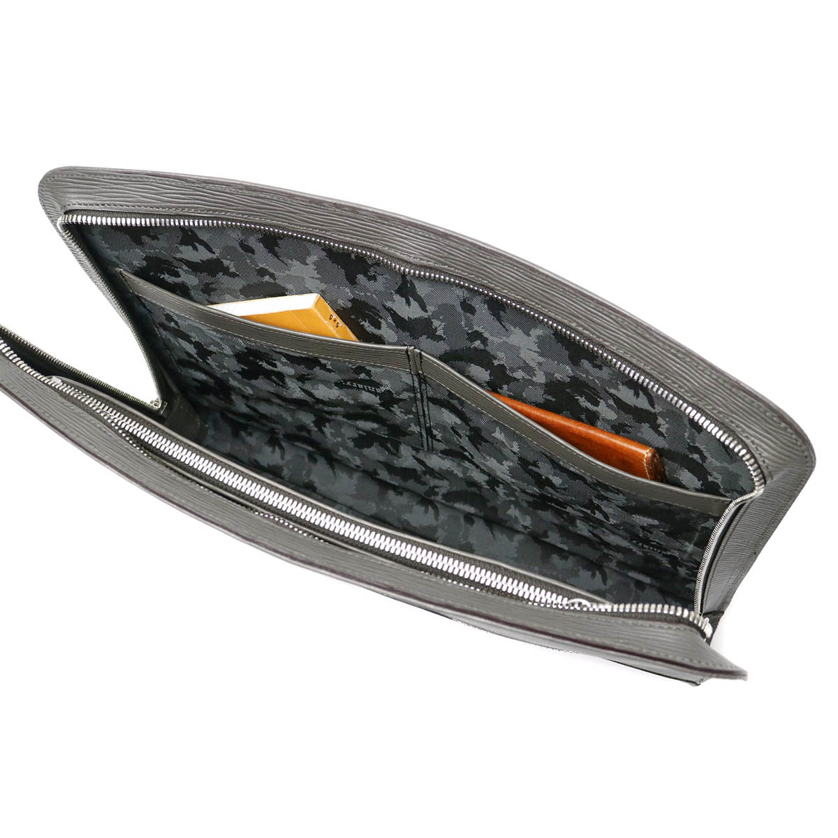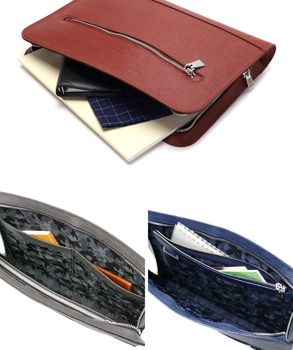 光のあたる海面を感じさせる「ウェーブレザー」を使用したクラッチバッグ。ハリがあり、ジップを引いた時にも革が波立たず、型崩れしないため、書類も安心して持ち運ぶことができます。