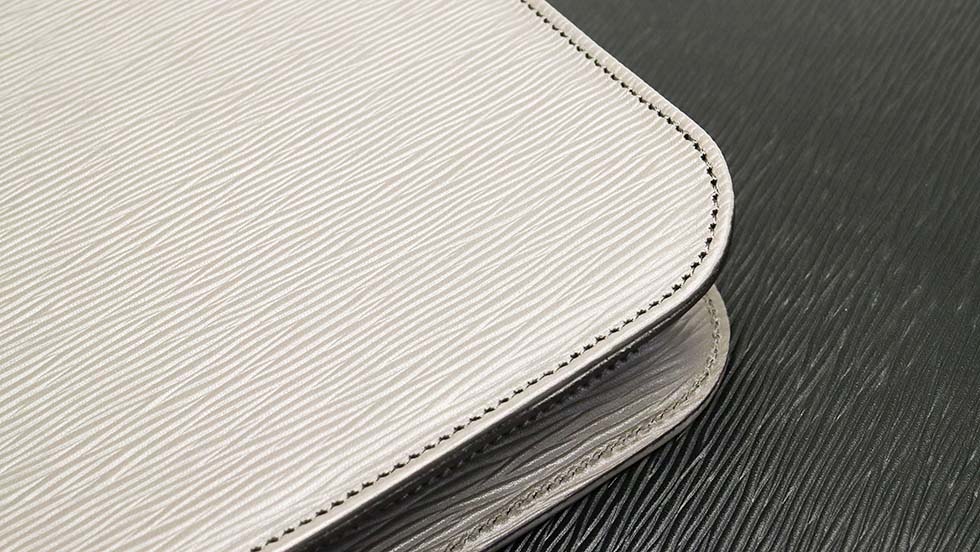 ポイントはワックスとアイロン工程によるツヤ出し加工で、海面に光があたる様を表現するべく波(型押し)の凹凸部で光沢の差を出しています。ハリ感があり、洗練された印象のスマートなレザーです。