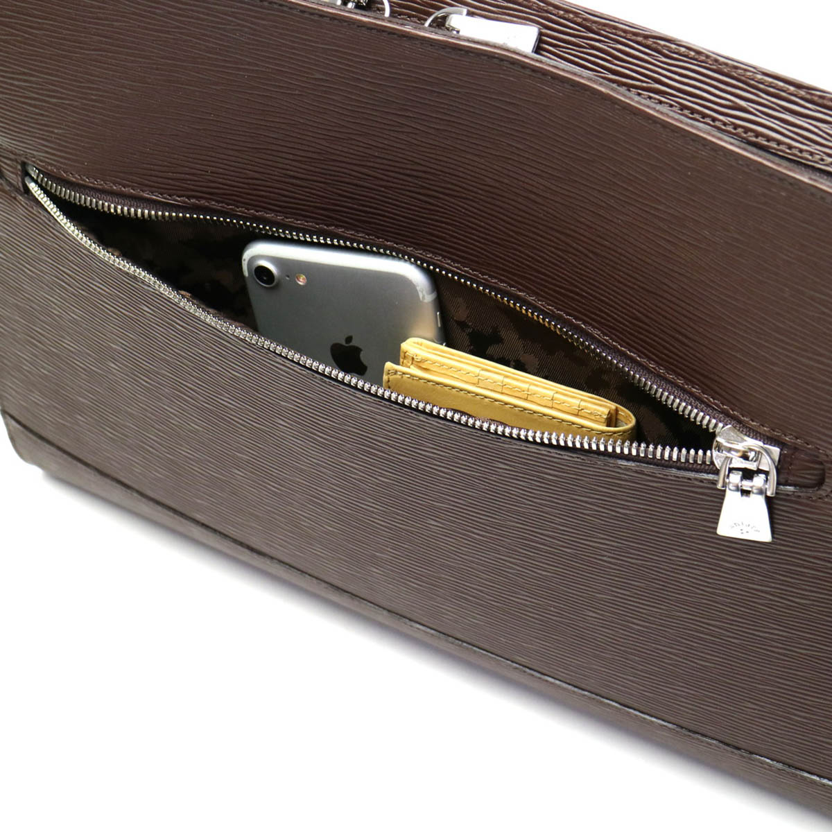 A4サイズの書類が収納可能なメインルームには、前後に大小異なるポケットを装備。小物類やシワになりやすい書類などを分けて管理することができます。