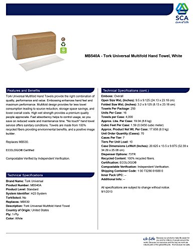 -. Title : Tork Universal MB540A Multifold Paper Hand Towel, 1-Ply, 9.5" Width x 9.13" Length, White, (Case of 16 Packs, 250 per Pack, 4,000 Towels)