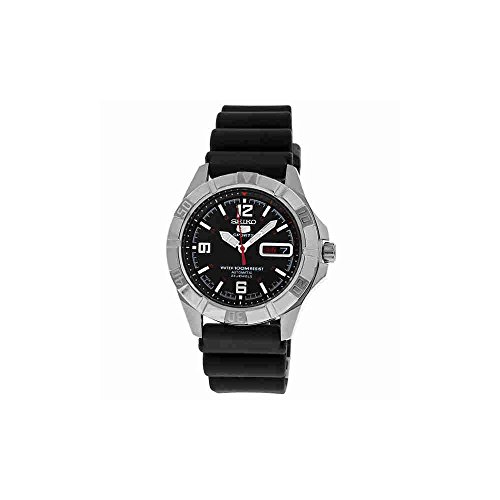 Stainless steel case with a black rubber strap. Fixed stainless steel bezel. Black dial with luminous hands and index hour markers. Arabic numerals mark the 6, 9 and 12 o'clock positions. 24 hour markings. Minute markers around the outer rim. Dial Type: Analog. Luminescent hands and markers. Day of the week and date display at the 3 o'clock position. Automatic movement. Scratch resistant hardlex crystal. Skeleton case back. Case diameter: 43 mm. Case thickness: 13 mm. Round case shape. Band width: 22 mm. Deployment clasp. Water resistant at 100 meters / 330 feet. Functions: date, day, hour, minute, second. Sport watch style. Watch label: Japan Movt. Seiko 5 Black Dial Stainless Steel Black Rubber Automatic Mens Watch SNZD23J1.Feature