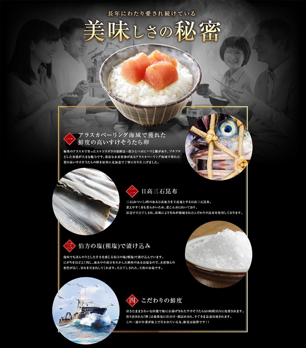 昆布の風味とたらこの一粒一粒が上品に香る贅沢な一品です。原産地:アラスカ産原材料:すけそうたら卵(アメリカ産)、昆布、食塩、調味料(アミノ酸等)、ソルビット、酒精、トレハロース、酸化防止剤(ビタミンC)、ナイアシン、甘味料(甘草、ステビア)、pH調整剤、酵素、発色剤(亜硝酸Na)