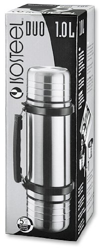 Studio : Isosteel Publisher : Isosteel Binding : Kitchen Product Description Isosteel Full Flask with folding handle and shoulder strap. Its simple but awesome! A vacuum flask with 2 screw drinking cups- For two to drink at the same time! The marking on the handle indicates which side is the pouring. Specifications - Material: Stainless Steel , Capacity: About 1.0 litres , Dishwasher-safe: No , Height: About 345 mm , Diameter: 95 mm , Filling diameter: About 49 mm , Weight: About 910 g. 0
