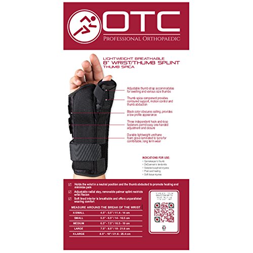 ReleaseDate : 2006-10-16 Studio : OTC Publisher : OTC Binding : Health and Beauty Product Description OTC brand (model 2087) lightweight breathable eight inch wrist thumb splint. Constructed from an open cell urethane foam laminated to a lycra fabric for comfort, breathability and moisture absorption. An excellent choice to treat DeQuervain's Tendinitis, strains and sprains of the MCP joint, basal joint arthritis, advanced carpal tunnel syndrome and cumulative trauma disorders of the thumb and wrist. Proximal circumferential strap provides superior fixation of the radial stay which allows for excellent immobilization of the thumb. Distal palmar crease contour allows for 90 degree palmar flexion and full finger dexterity. Perfect for latex sensitive wearers. Available for the left hand (model 2087/L) or right hand (model 2087/R). Use For: DeQuervain's tendonitis, strains and sprains of the MCP joint, basal joint arthritis, advanced carpal tunnel syndrome, cumulative trauma disorders of the thumb and wrist 0 |