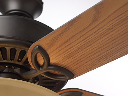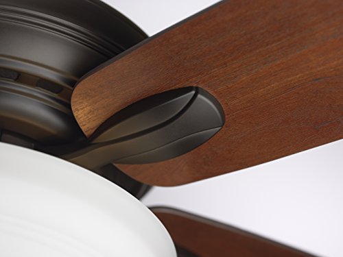 The Ashland's 52-inch Oil Rubbed Bronze housing, Dark Cherry/Walnut dual finish blades and removable light fixture with Opal Matte glass make this ceiling fan an elegant addition to any home décor. As the most versatile offering in our collection of Pro Series ceiling fans, Ashland transitional ceiling fans include a 4-1/2-inch downrod for standard installation or can be mounted on lower ceilings using the close-to-the-ceiling method. Ashland transitional ceiling fans are an easy 'all in the box' solution for today's design and money-savvy consumer and come equipped with 5 reversible blades and 3, 60-watt candelabra base bulbs for the removable light fixture. Pro Series ceiling fans are backed by Emerson's Limited Lifetime Motor Warranty.Feature