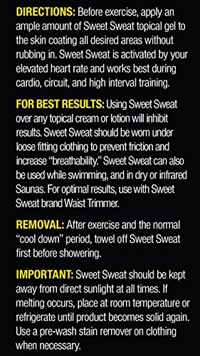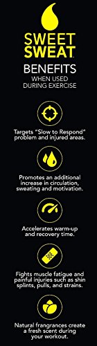 -. Binding : Health and Beauty -. Brand : Sports Research -. Feature : Sweet Sweat Targets "Slow to Respond" problem areas. / Substantially imporves Circulation & Sweating. / Encourages Motivation and Thermogenic activity during exercise. / Accelerates Warm-up and Recovery time. / Fights muscle fatigue and painful injuries such as shin splints, pulls and strans. -. Label : Sports Research -. LegalDisclaimer : *The product statements on this page have not been evaluated by the FDA. This product is not intended to diagnose, treat, or cure any disease. Actual product packaging and materials may contain more and different information than what is shown on our website. We recommend that you do not rely solely on the information presented and that you always read labels, warnings, and directions before using or consuming a product. -. Manufacturer : Sports Research -. ProductGroup : Health and Beauty -. ProductTypeName : HEALTH_PERSONAL_CARE -. Publisher : Sports Research -. Studio : Sports Research -. Title : Sports Research- Sweet Sweat Workout Enhancer - 6.4 oz Sports Stick