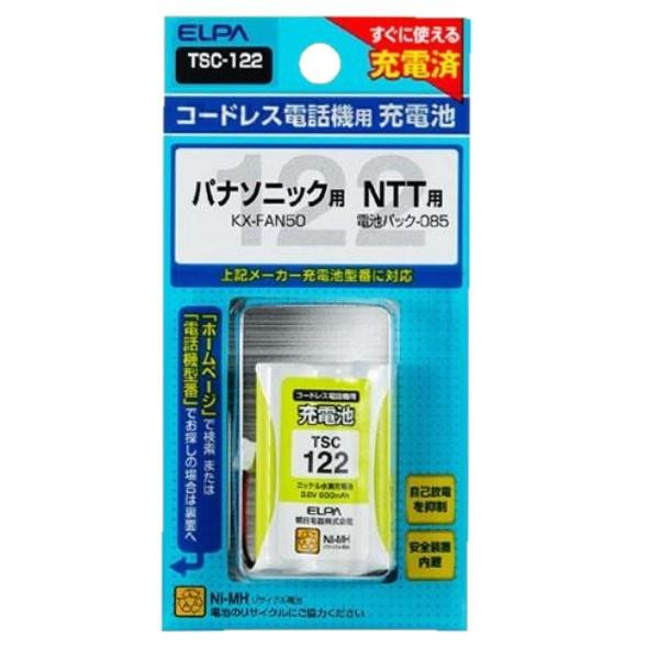 自己放電を抑制します。さらに安全装置が内蔵されています。 製造国:中国 仕様:適合機種・パナソニック:KX-FAN50・NTT:電池パック-085 同等品電話機用3.6V 600mAhニッケル水素充電池(充電済) ※サプライヤー直送品 ご注文後2~3営業日後の出荷となります【商品名】ELPA(エルパ) 電話機用充電池 TSC-122 1835300