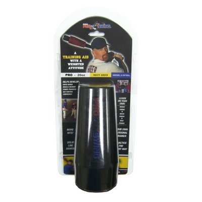Studio : RBI Pro Swing Publisher : RBI Pro Swing Binding : Sports Product Description Swing trainer and on deck bat weight. Designed to assist players with finding their correct swing pathe while increasing hand speed when swinging the bat. Helps players develop quick hands, power transfer, bat positioning, swing path and muscle memory. The device is filled with steel shot (small pellets) to give instant feedback to hitters. Place it on the end of the bat barrel. Once the hand and feet are set in the proper position the steel shot is moved and located in the base of the chamber. As the swing begins, the shot is moved through the chamber and at the point of impact the shot whips through the chambers. Allows the batter to geel the power as well as hear the shot as they reach the impact zone of their swing. Batting drills included. Endorsed by Texas Rangers Hall of Fameer Rusty Greer. 0