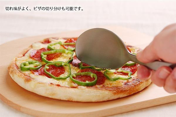 | 食卓でちょっと切りたいときに、包丁とまな板を出すのは面倒。すくえるナイフなら、お皿の上で片手でサッとカットして、そのまますくって取り分けることができます。ピザのカットにもお使いいただけます♪ |