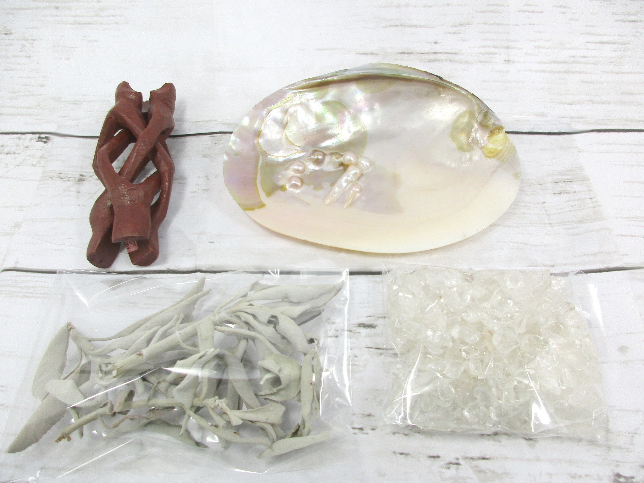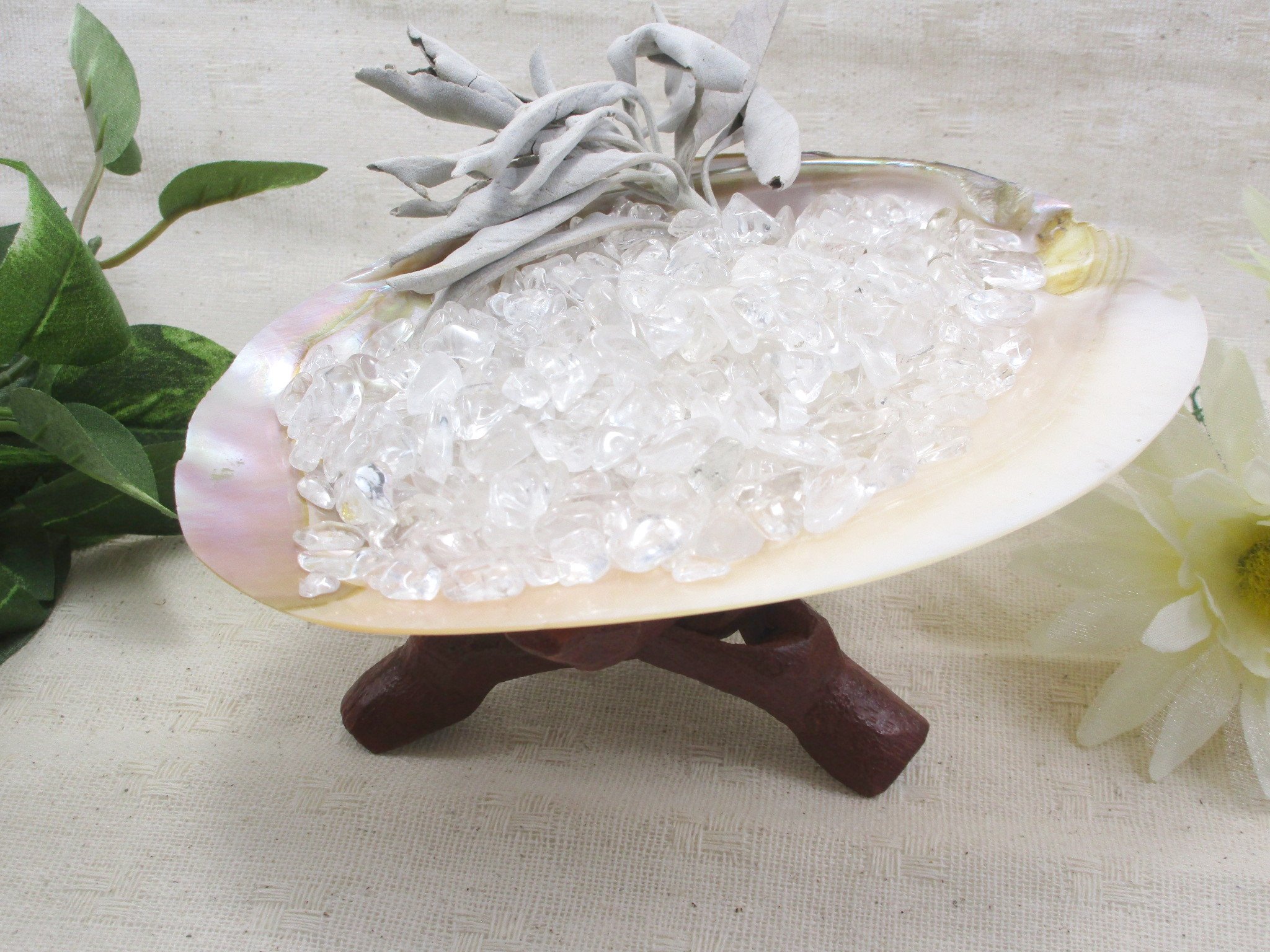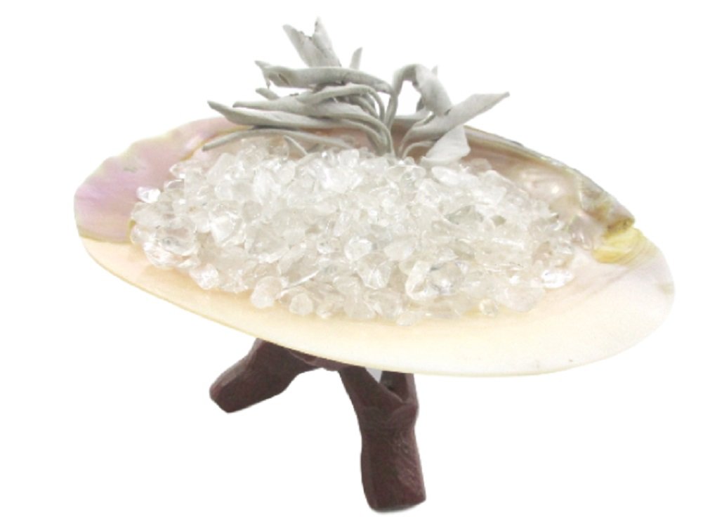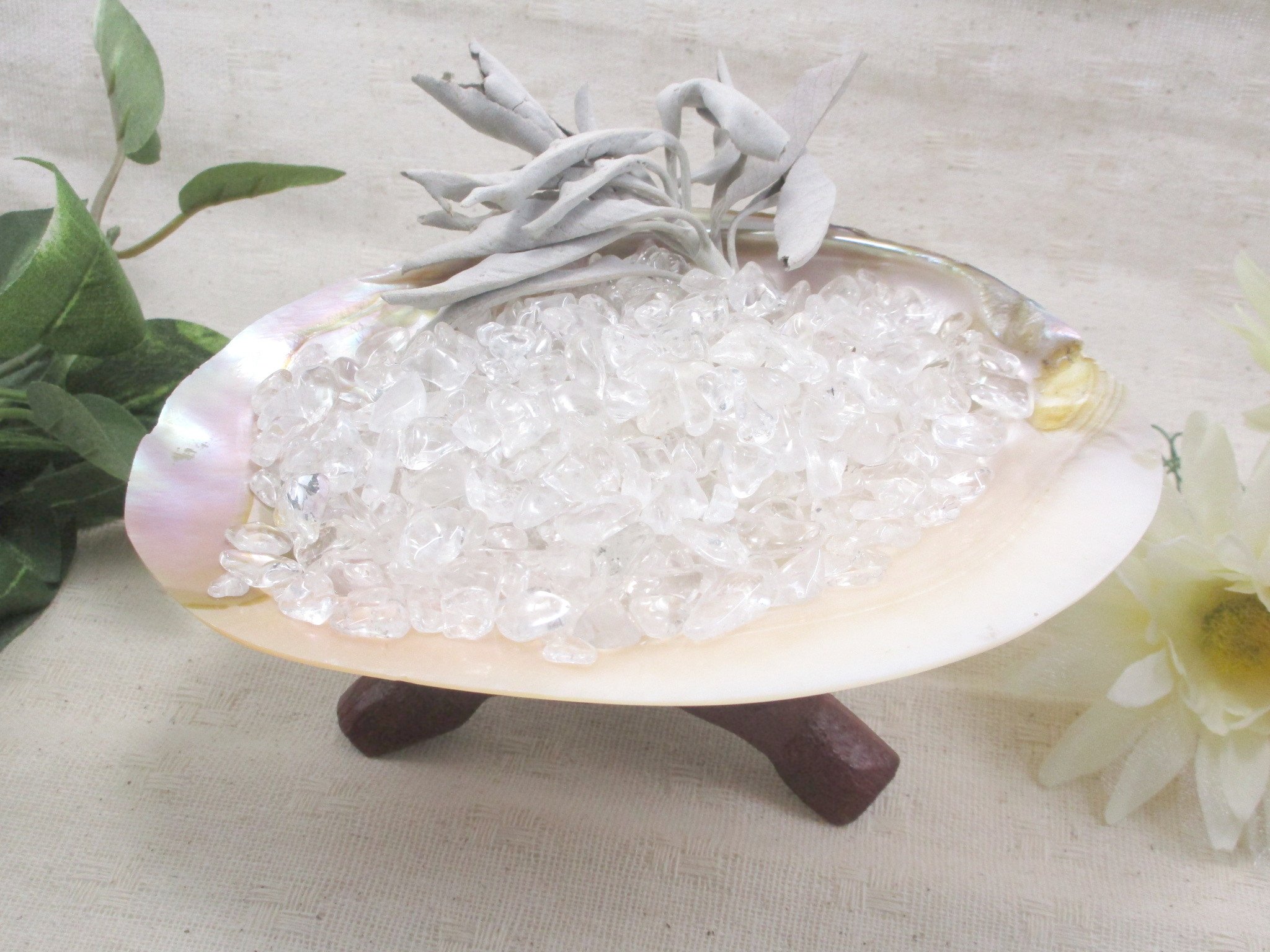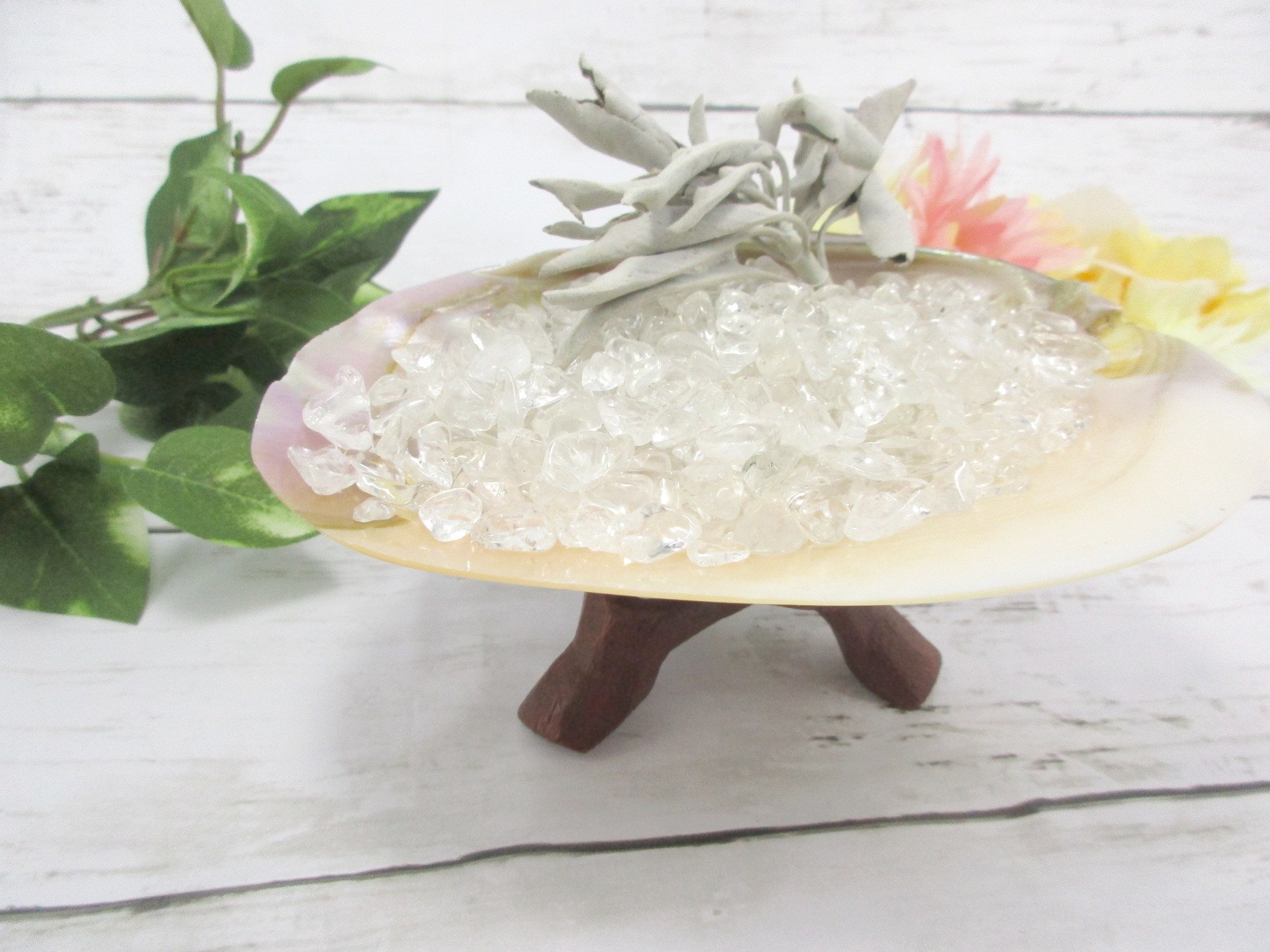 [Contents] Set of 4: Pure Shell (Pond Shellfish) × 1 White Sage × Approximately 8 to 10 g Crystal Sacrifice (3 to 10 mm) from Himalayas × Approximately 150 g, Wood Stand × 1