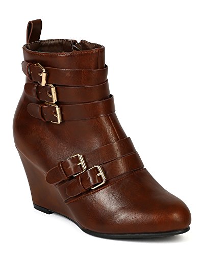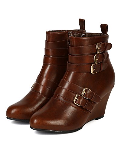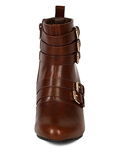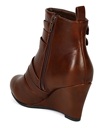 (Nature Breeze)/Women's/Boots/DIRECT FROM USA/Nature Breeze BD53 Women Leatherette Almond Toe s trap Buckles Ankle Wedge Bootie - Cognac