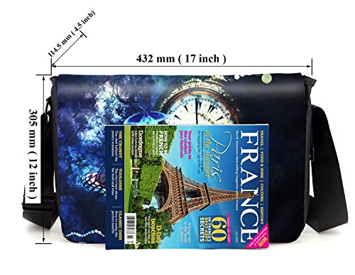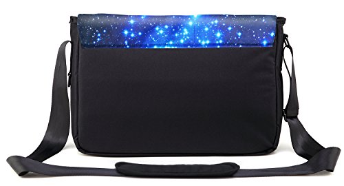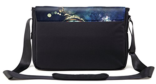 -. Feature : Unique, cool sleek artwork design on premium quality rain proof polyester material / Main padded computer compartment with velcro flap & Padded document, textbook compartment / 2 zipper pockets: 7"H x 10.5"W and 5" x 10.5" with many accessories pockets and pen holders / Soft, wide adjustable shoulder strap with shoulder pad / Overall dimension: Approx. 17"W x 12"H x 4.5" D