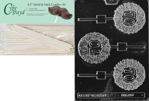 Cybrtrayd 45St50-L031 70th Lolly Letters and Numbers Chocolate Candy Mold with 50-Pack 4.5-Inch Lollipop Sticks