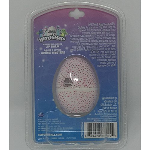 Limited Edition Mystery flavors Comes in a Colleggtible speckled egg 2 pack of Hatchimal Lip Balm 1 pink egg & 1 purple egg Brand : Hatchimal Bundle EAN : 0654329907160 Package Dimensions(LxWxH) : 16x11x8cm ; 64 g