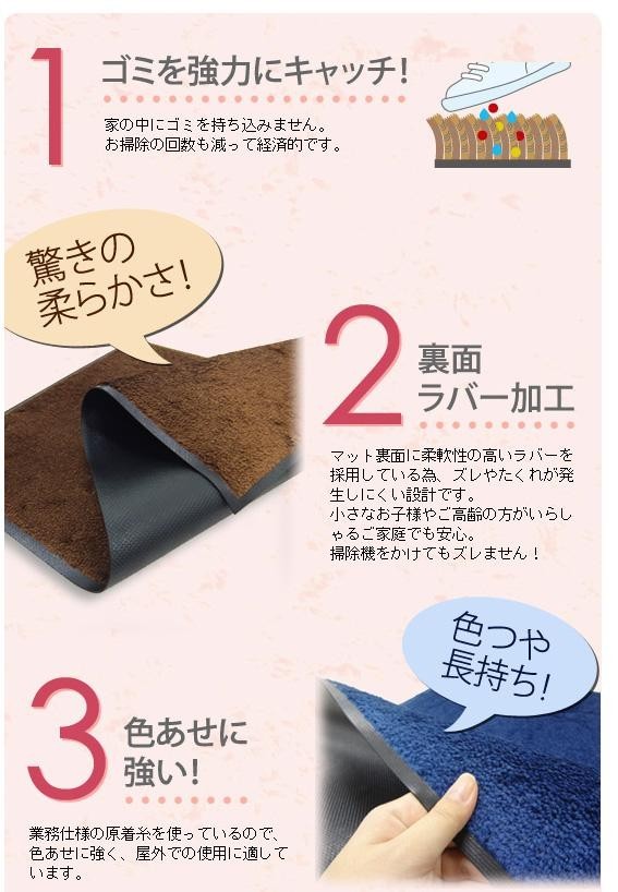 | ゴミを強力にキャッチ、高密度なパイルの中に取り込んで表の汚れを目立たなくします。マット裏面に柔軟性の高いラバーを採用、ズレやたくれが発生しにくい設計です。室内・屋内・屋外兼用なので、様々なシチュエーションでお使いいただけます♪ |