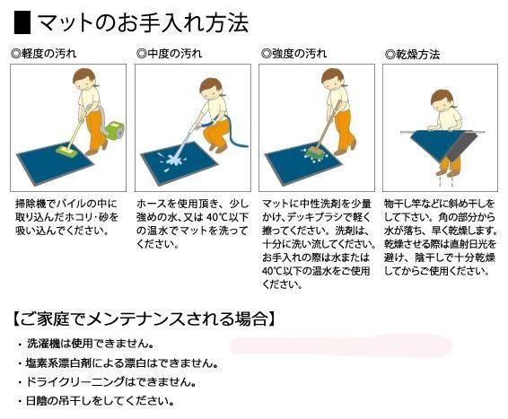 | 仕様 | 室内・屋内・屋外兼用 吸水・除塵/滑り止め機能付 防炎認定品 グリーン購入法適合品 PETボトル再利用品認定 |