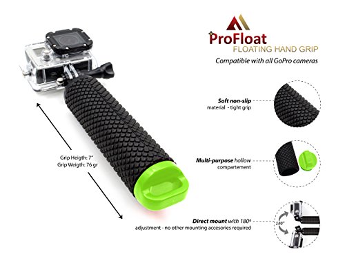 ►TEXTURED NON-SLIP EVA GRIP HANDLE FOR TIGHT GRIP: The design of the ProFloat factors for the wet condition that the grip will be used in. The high quality non-slip foam handle delivers tight grip and extra comfort. The ProFloat grip stabilizer provides easy aiming and allows you capture a variety of angles with increased stability and control. This pocket-size portable & lightweight hand grip is 7 inches tall and only weighs under 80 grams. A great addition to your GoPro accessories.
