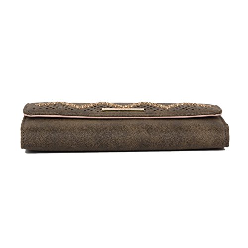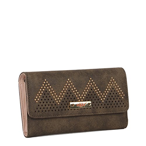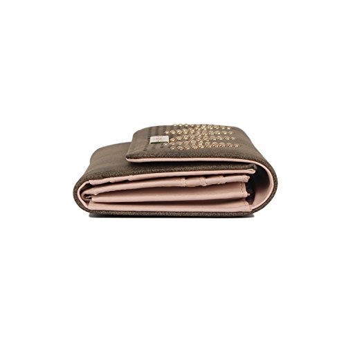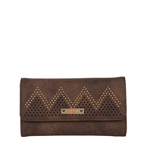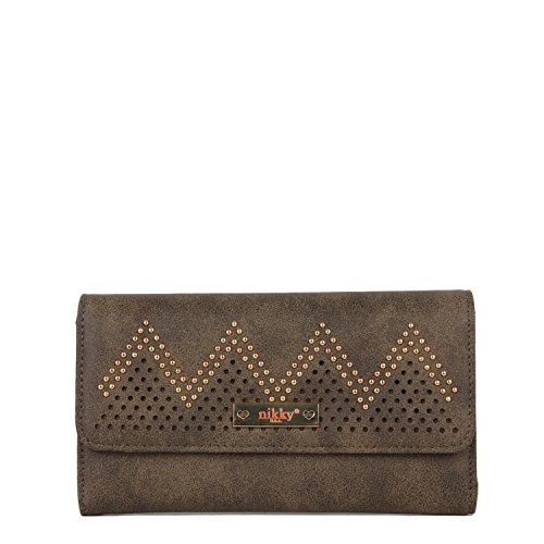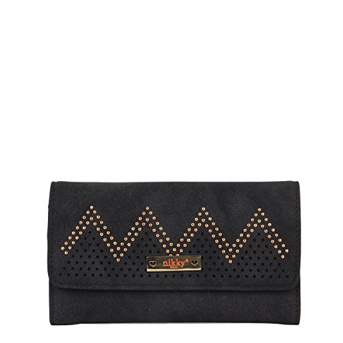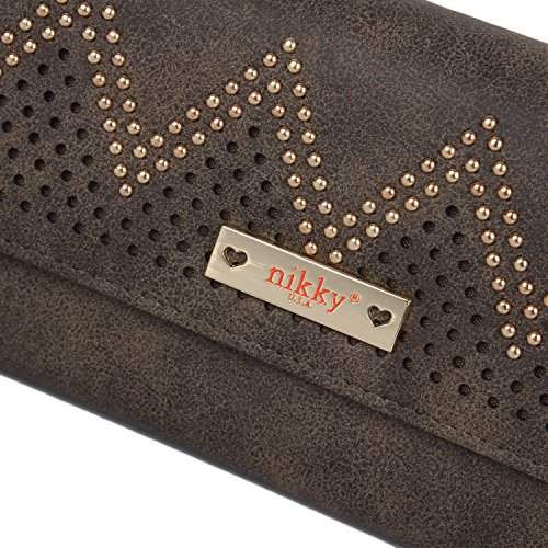 Binding : Apparel Product Description The studded laser cut pyramid design makes this Nikky Brisa wallet an eye-catching statement accessory while keeping you organized. Exterior Features: Made of high quality eco-leather. Trifold design with snap closure. Studded laser cut design on front flap. Signature Nikky logo nameplate. Interior Features: Two ID windows with multiple credit card slots. Multiple bill slots. Zip-up coin pocket. Eco-leather and nylon Nikky polka dot lining. RFID (Radio-frequency identification) BLOCKING WALLET. The fight against identity theft starts with your wallet. Nikky Wallets are manufactured with RFID-Blocking technology that prevents reader device signals from penetrating your wallet keeping your contents secure. For cleaning, wipe with damp cloth. 0