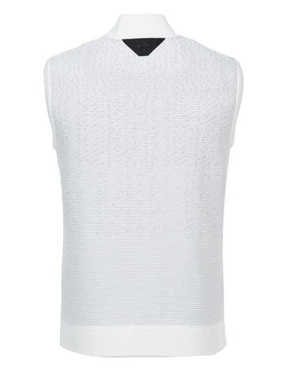 뒷면으로 은은한 스트라이프 패턴을 배색해 세련된 느낌을 주는 베스트입니다.