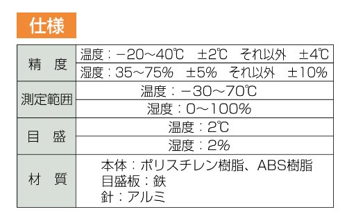 -. Feature : メーカー型番: 72674 / サイズ: 直径48×17mm / 質量: 11g / 材質: スチロール樹脂、ABS樹脂、アルミ / 精度: 温度計:-21度以下はプラスマイナス4度、-20~40度はプラスマイナス2度、41度以上はプラスマイナス4度、湿度計:34%以下はプラスマイナス10%、35~75%はプラスマイナス5%、76%以上はプラスマイナス10% / 測定範囲: 温度計:-30度~70度、湿度計:0~100% / 目盛: 温度計:2度、湿度計:2%