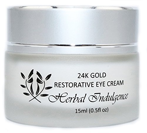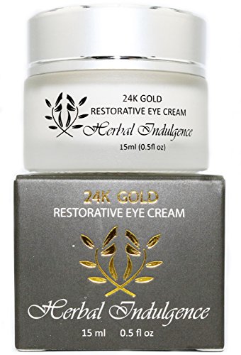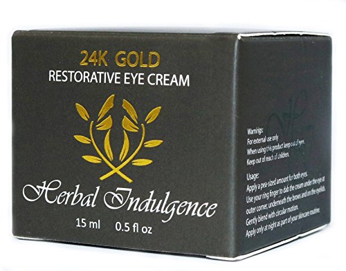 This 24K GOLD Restorative eye cream contains 38 natural non-GMO ingredients. While each a miracle of nature their real power is in their synergy. Comparable products are mostly water. Herbal Indulgence eye cream contains just 12.9% water, enough to combine and activate the ingredients. The rest is the very best that nature and science have created for your skin.