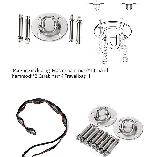 Material: hammock Fabric: 210T Nisi Fang (also known as parachute cloth), hanging plate Material: 201 stainless steel, extension belt Material: high-strength polyester Size: 2.73 yards x 1.65 yards (2.5m x 1.5m) Product weight: 4.4 oz(2kg) Loading Capacity: 441 lbs (200kg) Package Contents: 6 hand hammock 2 daisy chain 2 carabiner Accessories; Packing: with the same color storage bag