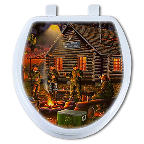 Product Description Showcase your rustic style with the Campfire Tales Toilet Seat - Round, designed with several men telling stories around a campfire in front of their log cabin. Image has hand painted texture and look without the high cost High density molded wood with melamine white gloss finish Easy close lid and ring 15 1/2"W x 2"D x 17 1/2"H Clean with mild antibacterial hand soap White high gloss with neoprene bumpers Easy Clean hinges and Stay Tight hardware to hold the seat tightly on the bowl Installation hardware included Made in the USA ~ Ships from the manufacturer. Allow 1 to 2 weeks. Cannot express ship. 0
