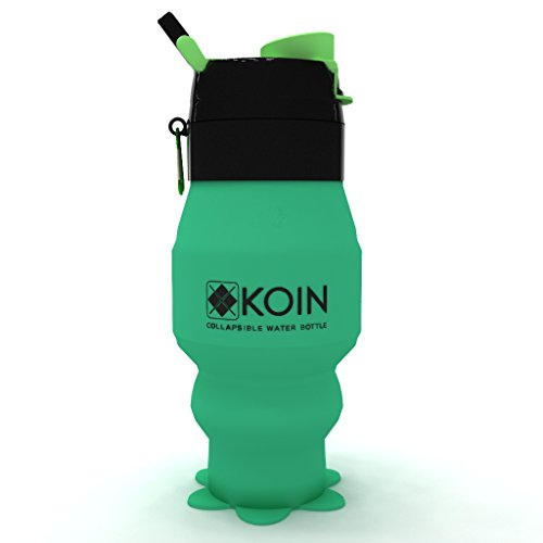 Collapsible Water Bottle by Koin Foldable BPA Free Silicone Canteen w/ Carabiner | Travel Sports Outdoors Easy To Clean and Store Portable Flask, 18fl oz, Leak Proof, Non Toxic