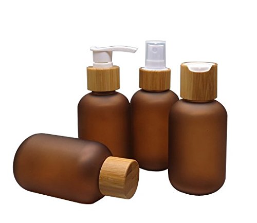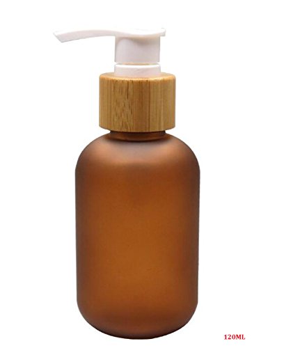 120ML Refillable Amber Plastic Lotion Dispenser Bottle Jar Container with Natural Bamboo Pump for Makeup Cosmetic Bath Shower Shampoo Hair-Conditioner Liquid Soap Toiletries Liquid Bathroom Accessory