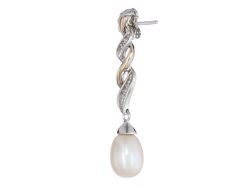 Intertwined 14k yellow gold and sterling silver drop earring with diamonds and freshwater pearl featuring friction-back closure