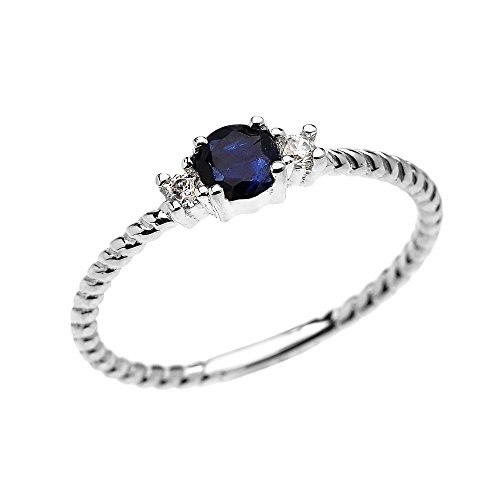 -. Title : 10k White Gold Dainty Solitaire Sapphire and White Topaz Rope Design Stackable/Proposal Ring