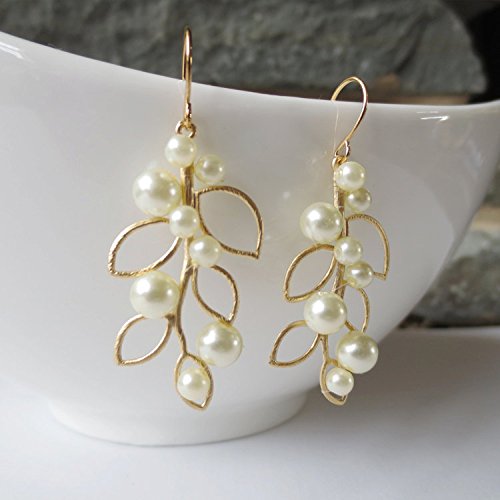 -. Title : Gold Pearl Leaf Earrings