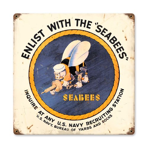 - This Sea Bees Vintage Metal Sign measures 12 inches by 12 inches and weighs 1 pounds.